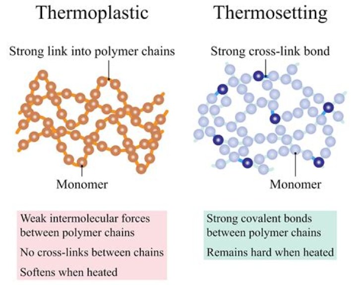 These are the plastics that cannot be softened by heating once they are moulded. The main thermosetting plastics are epoxy resin, melamine formaldehyde, polyester resin etc.