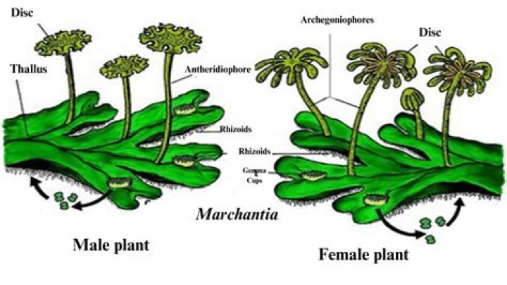 In liverworts such as Marchantia, the flattened plant body or thallus is a haploid gametophyte with gemma cups scattered about its upper surface. The gemma cups are cup-like structures containing gemmae. The gemmae are small discs of haploid tissue, and they directly give rise to new gametophytes.