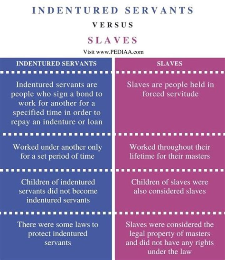 - difference 1. slaves were forever, while indentured servants had a contract. ...