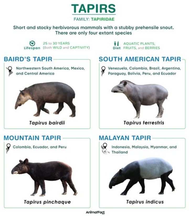 There are four living species of tapir, each with a distinct appearance and habitat range. ... They are becoming rare in their habitats, mostly due to habitat destruction and poaching, and they are designated as either Vulnerable or Endangered as a result.