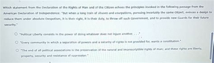 What are 3 main points in the Declaration of the Rights of Man? These rights are liberty, property, security, and resistance to oppression.