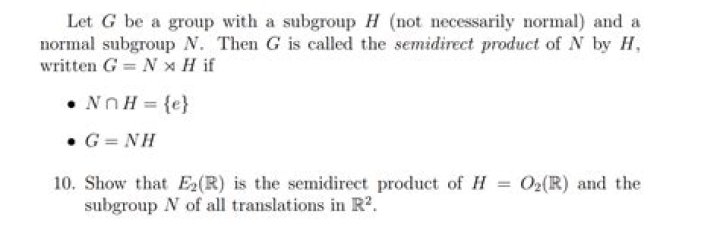 In mathematics, specifically in group theory, the concept of a semidirect product is a generalization of a direct product. ... an inner semidirect product is a particular way in which a group can be made up of two subgroups, one of which is a normal subgroup.