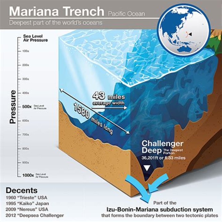 Everest, the Mariana Trench was first pinpointed in 1951 by the British Survey ship Challenger II. Known since as Challenger Deep, it was not visited for nearly ten years. Jacques Piccard and Don Walsh descended in a submersible called the Trieste, which could withstand over 16,000 pounds of pressure per square inch.
