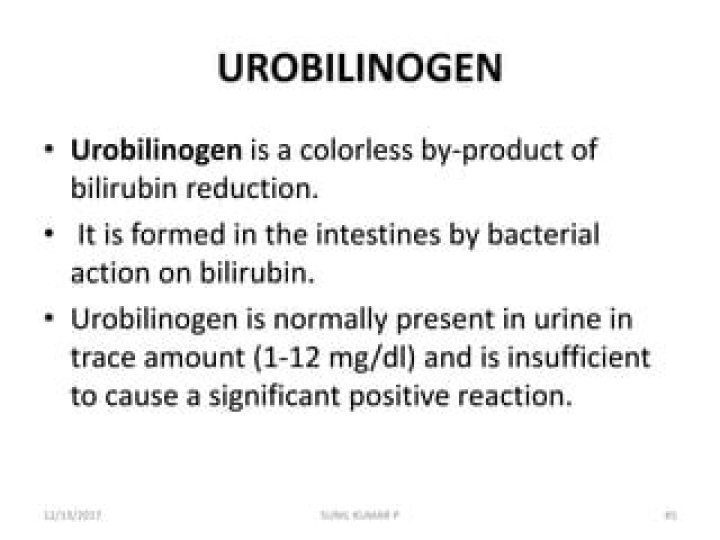 The normal urobilinogen concentration in urine ranges from 0.1-1.8 mg/dl (1.7-30 µmol/l), concentrations >2.0 mg/dl (34 µmol/l) are considered to be pathological.