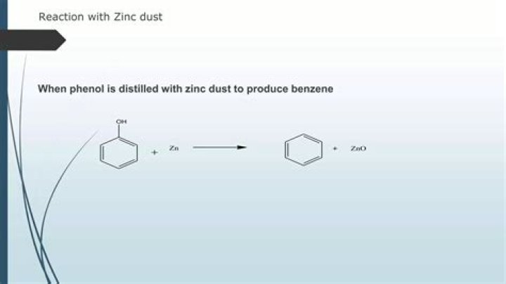 -Phenol undergoes a reduction reaction when heated with Zinc dust and forms benzene. ... -Therefore when phenol is distilled with Zn dust, the main product is Benzene and zinc oxide also formed as a sub-product.