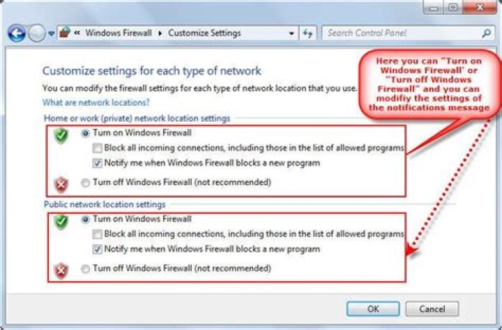 - Select the Turn on Windows Firewall radio button for one or both of the network locations.