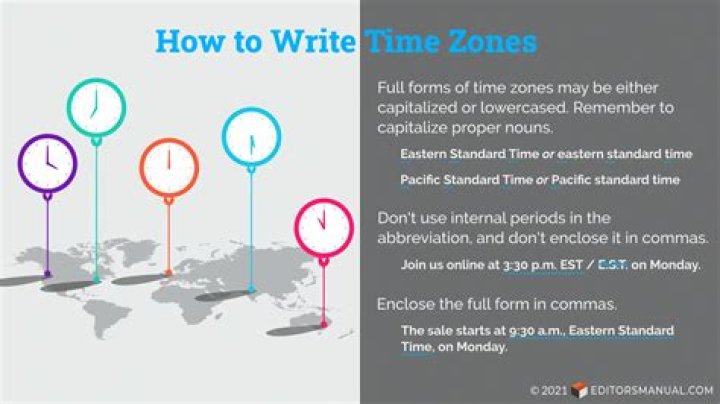 If you need to indicate that a time is in a certain time zone, the simplest way to do it is to put the time zone abbreviation after the time: for Eastern Standard Time, write “4:30 p.m. EST.”