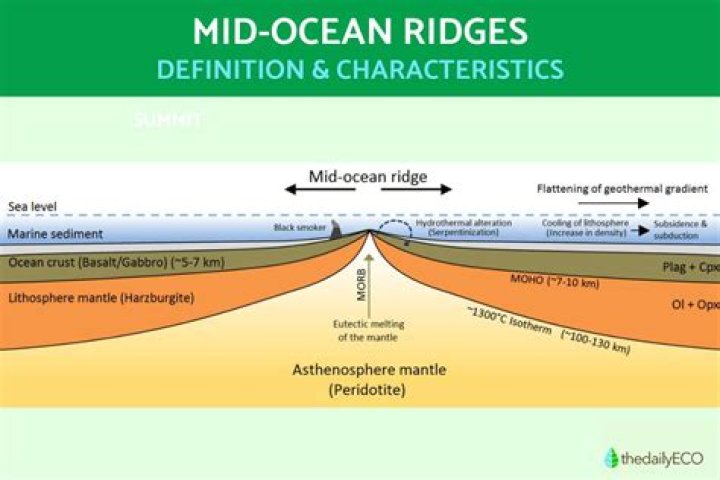 A mid-ocean ridge or mid-oceanic ridge is an underwater mountain range, formed by plate tectonics. This uplifting of the ocean floor occurs when convection currents rise in the mantle beneath the oceanic crust and create magma where two tectonic plates meet at a divergent boundary.