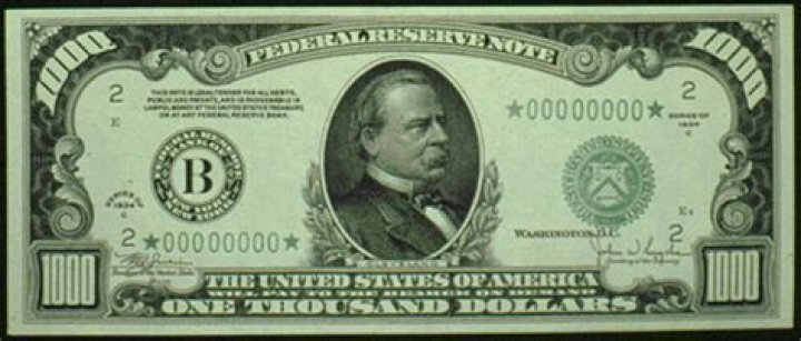 President Grover Cleveland's face appears on the $1,000 bill, which like the $500 bill dates to 1918. Hamilton's face initially appeared on the denomination. The Fed and Treasury discontinued the $1,000 bill in 1969.