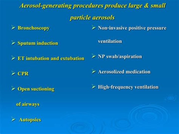 The World Health Organization stipulates that intubation, noninvasive positive pressure ventilation, tracheotomy, cardiopulmonary resuscitation, bronchoscopy, and sputum induction are definite aerosol-generating procedures because epidemiologic studies have associated these procedures with greater risk for health care ...