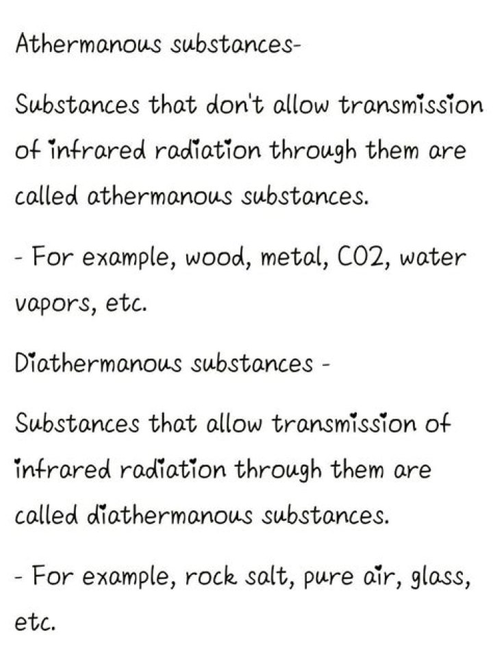Substances which allow transmission of infrared radiation through them are called athermanous substances. - For example, wood, metal, CO2, water vapors, etc.