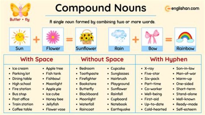 There are different types of compound nouns. Some compound nouns are one word (teabag, snowman, football), some are two words (apple tree, water park), and some are hyphenated (self-control, half-brother).