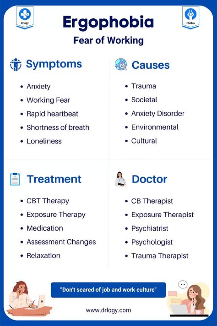 The symptoms Ergophobia is characterised by fear of work, says Ernst. "This fear is persistent and leads to symptoms of anxiety (heart palpitations, difficulty breathing, chest pain, numbness/tingling sensations, dry mouth, dizziness, excessive sweating, nausea which can escalate into a full-blown panic attack."