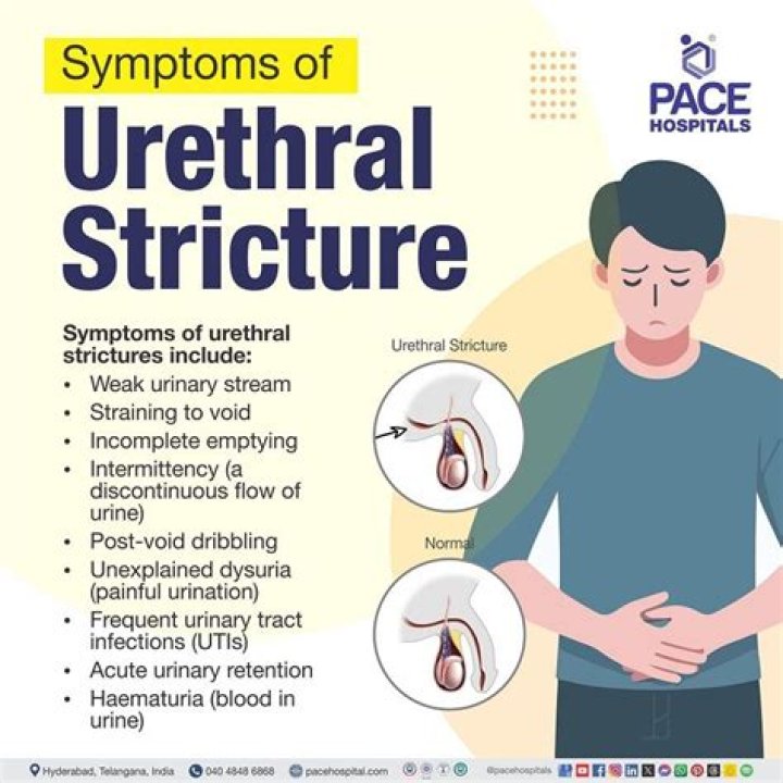 In addition to uncomfortable urinary symptoms such as reduced flow rate and more frequent urination, a urethral stricture can lead to complications that include urinary tract infections, prostatitis, urinary retention and kidney damage.