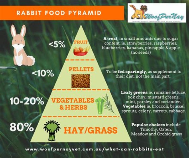 Rabbits love their food and enjoy fresh fruits and vegetables as part of a balanced diet. The main part of a rabbit's diet should be unlimited amounts of fresh hay (preferably Timothy or Meadow Hay), grass, and plenty of clean water available.
