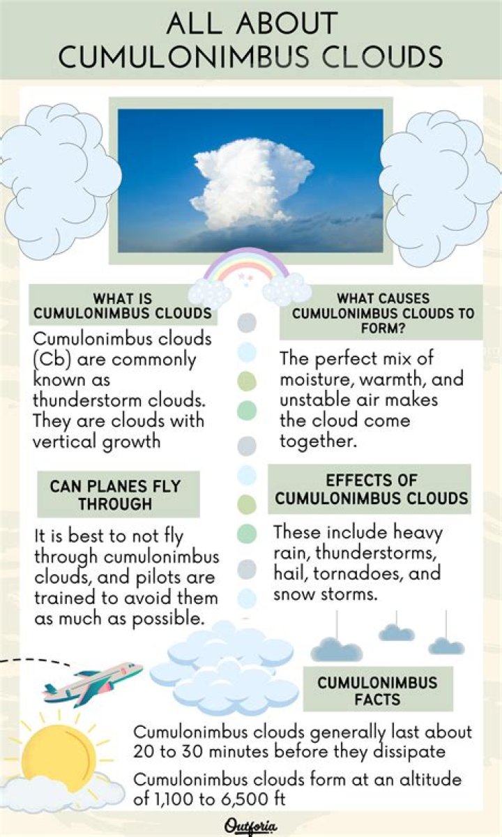 Cumulonimbus clouds are large, tall clouds that are dark on the bottom, bring thunderstorms, have a fuzzy outline toward the upper part of the cloud and may have a flat top called an anvil. Besides thunderstorms, these clouds can bring hail, tornadoes and snow, and they also form during hurricanes.