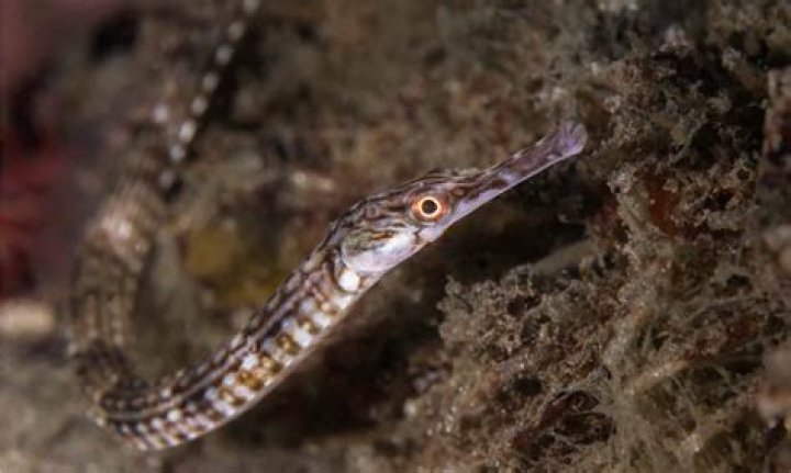 Pipefish look like straight-bodied seahorses with tiny mouths. The name is derived from the peculiar form of the snout, which is like a long tube, ending in a narrow and small mouth which opens upwards and is toothless. The body and tail are long, thin, and snake-like.
