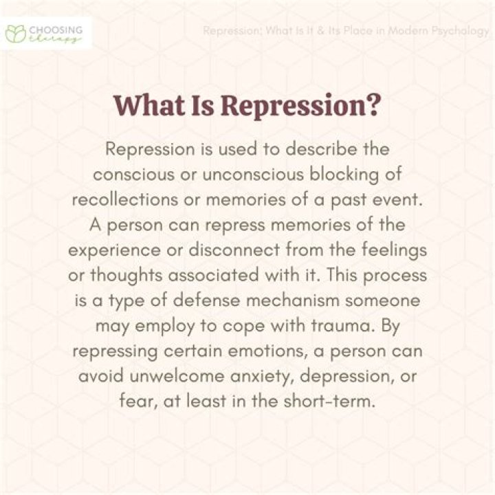 Repression is the unconscious blocking of unpleasant emotions, impulses, memories, and thoughts from your conscious mind. Introduced by Sigmund Freud, the purpose of this defense mechanism is to try to minimize feelings of guilt and anxiety.
