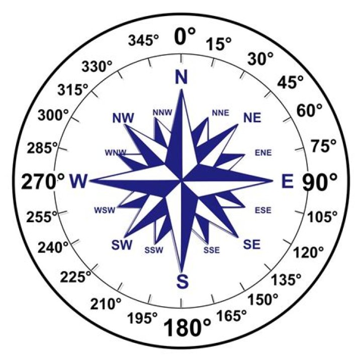 An angle of 0° corresponds to north, a 90° angle corresponds to east, a 180° angle to south, 270° to west and finally, an angle of 360° (that is, a full circle) corresponds again to north.