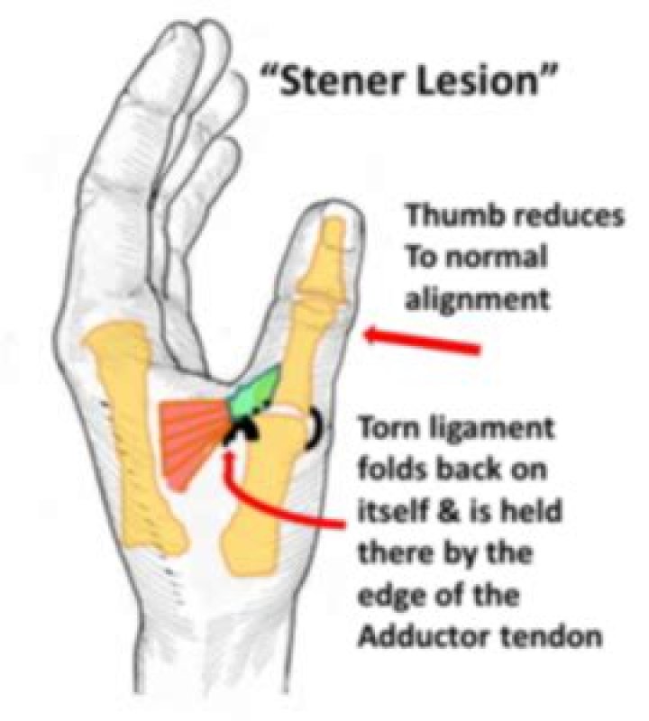 A Stener lesion occurs when a complete distal, thumb ulnar collateral ligament tear results in the interposition of the aponeurosis of the adductor pollicis muscle between the metacarpophalangeal joint and torn ligament.