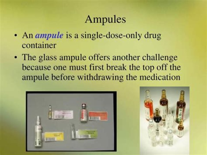 Ampules are glass containers in 1 ml to 10 ml sizes that hold a single dose of medication in liquid form. They are made of glass and have a scored neck to indicate where to break the ampule (see Figure 7.2).