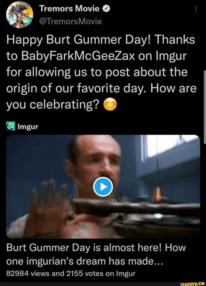 April 14 is also known as Burt Gummer Day. It was founded in 2017 by Imgur user @BabyFarkMcGeeZax to celebrate the legendary Burt Gummer. At the end of Tremors: Shrieker Island, a message orders fans to celebrate Burt Gummer Day on April 14 and to pay their taxes.