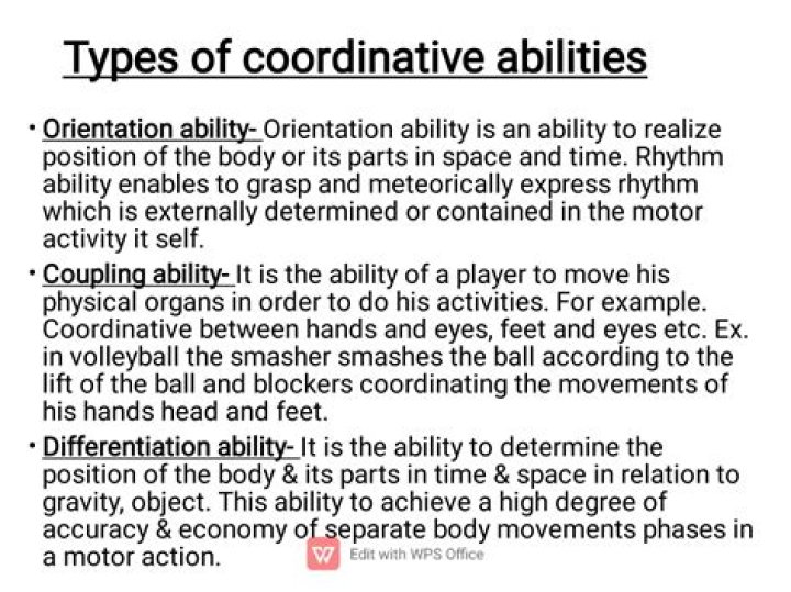 Coordination ability means an ability to quickly and purposefully perform difficult Spatio-temporal movement structures. ... Coupling ability: It is the ability to coordinate body part movements in relation to a definite goal, oriented body movement.