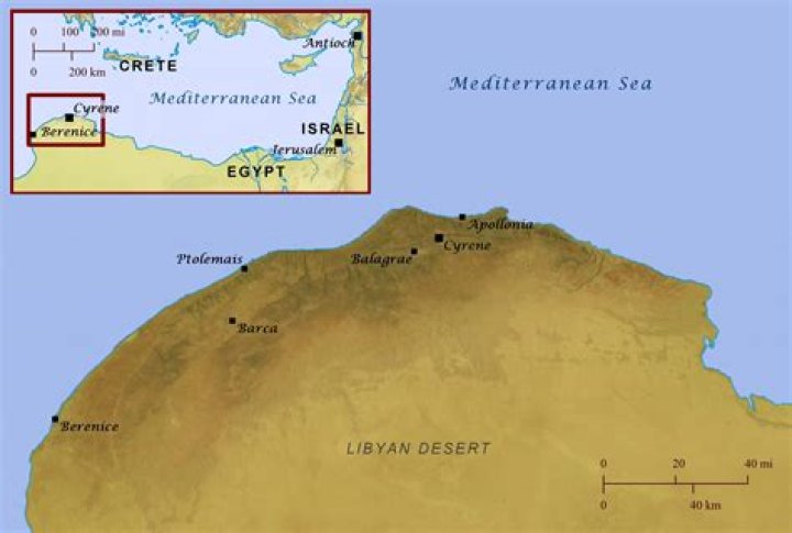 Cyrene was located in northern Africa in eastern Libya. A Greek city in the province of Cyrenaica, it had a Jewish community where 100,000 Judean Jews had been forced to settle during the reign of Ptolemy Soter (323–285 BC) and was an early center of Christianity.