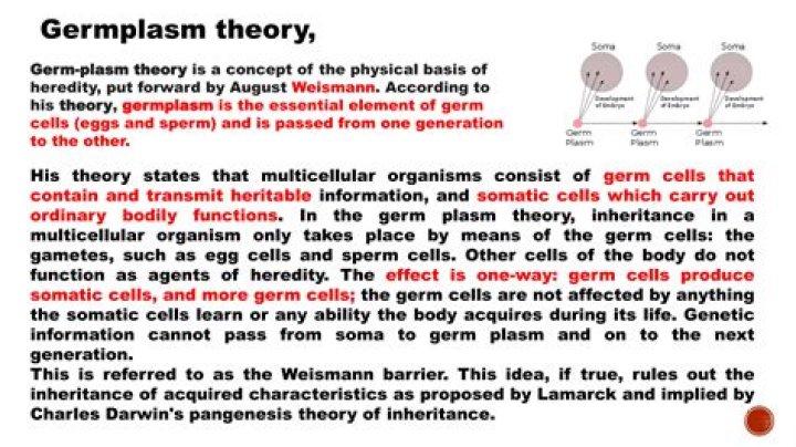 According to his theory, germ plasm, which is independent from all other cells of the body (somatoplasm), is the essential element of germ cells (eggs and sperm) and is the hereditary material that is passed from generation to generation. Weismann first proposed this theory in 1883; it was later published in his ...