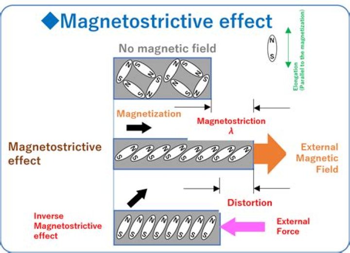 Magnetostriction (cf. electrostriction) is a property of magnetic materials that causes them to change their shape or dimensions during the process of magnetization. The variation of materials' magnetization due to the applied magnetic field changes the magnetostrictive strain until reaching its saturation value, λ.