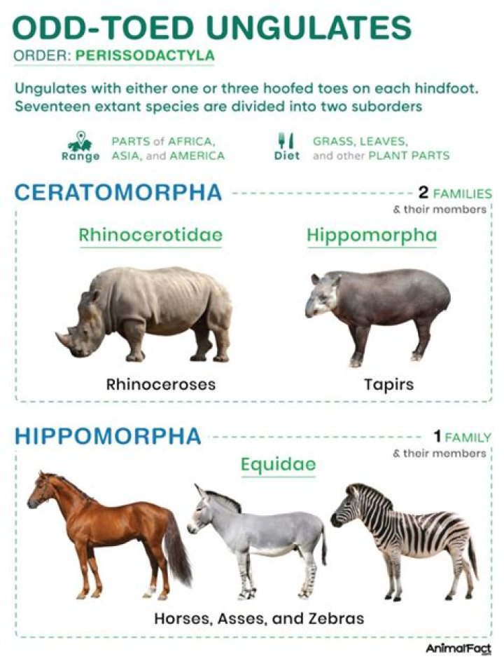 Perissodactyla - horses, rhinoceroses, tapirs. There are 16 species of large mammals in this order in three families. The species in this order have an odd number of toes on their feet. In fact, they are sometimes called odd-toed ungulates.