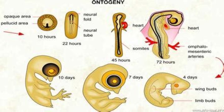 Ontogeny and phylogeny. By studying ontogeny (the development of embryos), scientists can learn about the evolutionary history of organisms. ... For example, both chick and human embryos go through a stage where they have slits and arches in their necks that are identical to the gill slits and gill arches of fish.