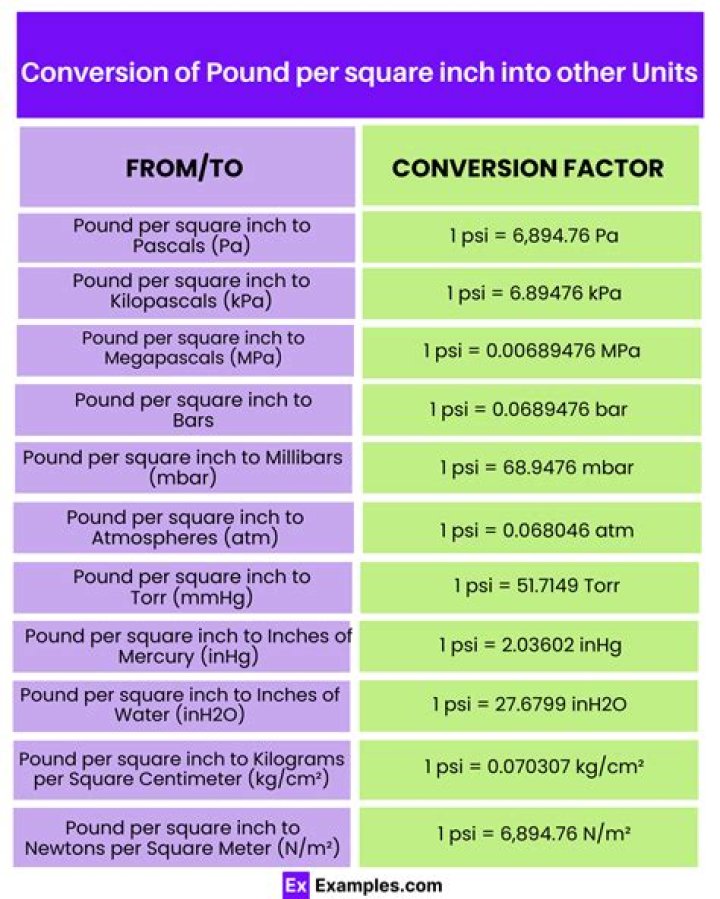 To convert a pound per square inch measurement to a pascal measurement, multiply the pressure by the conversion ratio. The pressure in pascals is equal to the pounds per square inch multiplied by 6,894.75.