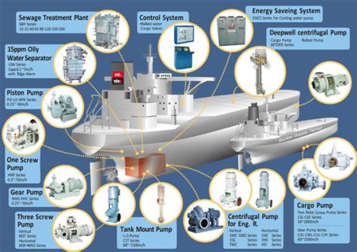 Auxiliary marine machinery includes pumps, compressors, and blowers for circulating fuel and the fresh water and seawater used in cooling systems, for supplying air to the starting system of the main engine, for cooling refrigerated holds, and for air-conditioning various parts of the ship and for refrigeration ...