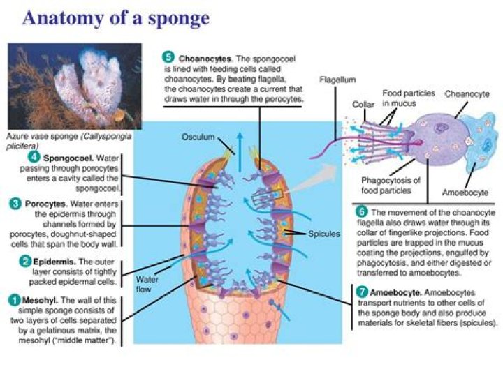 Water enters the spongocoel through hundreds of tiny pores (ostia) and exits through the larger opening (osculum). Depending on the body plan of the sponge (which can be asconoid, syconoid, or leuconoid), the spongocoel could be a simple interior space of the sponge or a complexly branched inner structure.
