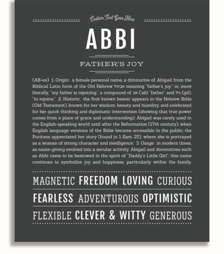 Abigail means "cause of joy" or "father's joy" in Hebrew. In the Bible, Abigail is described as a beautiful and intelligent woman.