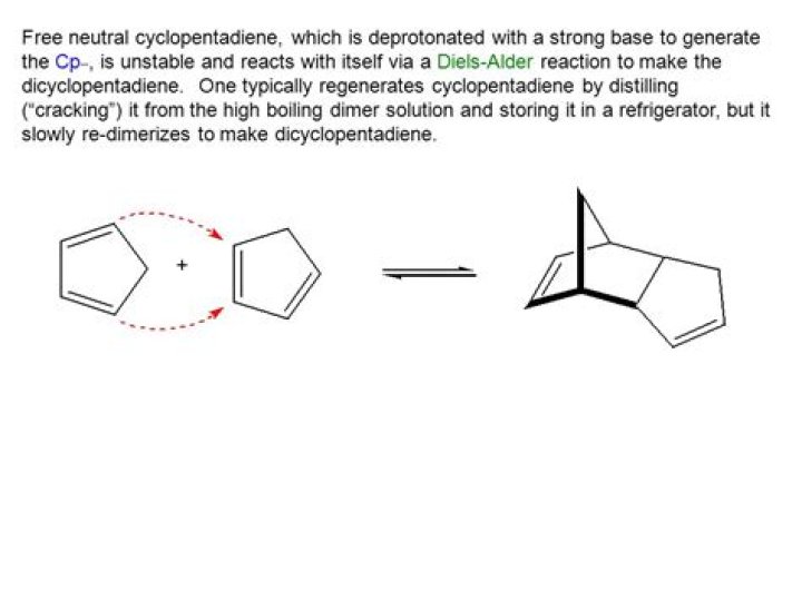 Cyclopentadiene Slowly Undergoes A Diels-Alder Reaction With Itself To Give “Dicyclopentadiene”, Which Reverts Back To Cyclopentadiene Upon Heating To 180°C. ... That means that one molecule of cyclopentadiene acts as a diene, and another molecule of cyclopentadiene acts as a dienophile.