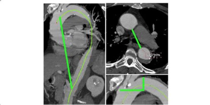 Tortuosity of the aorta was defined as the length of the midline within the aorta divided by the linear distance between the aortic root and the iliac bifurcation, and tortuosity of the ascending aorta was defined as the measured length of the ascending aorta divided by the linear distance between the aortic root and ...