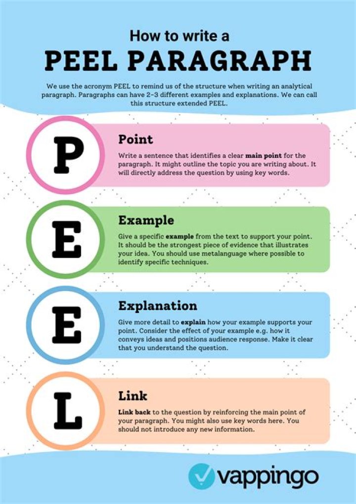 The PEEL paragraph method is a technique used in writing to help structure paragraphs in a way that presents a single clear and focused argument, which links back to the essay topic or thesis statement. ... It allows you to create a paragraph that is easy and accessible for others to understand.