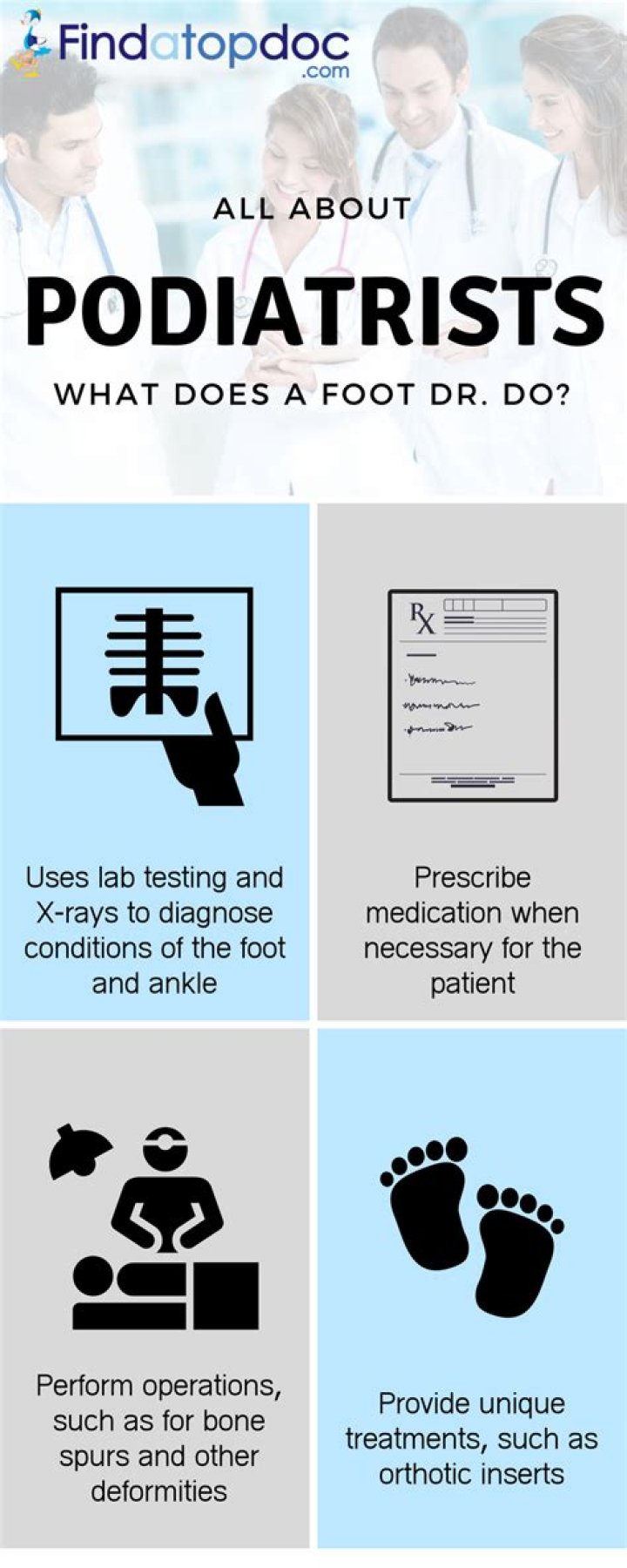Podiatrists treat problems with a patient's foot or lower leg. They can set fractures, write prescriptions, recommend physical therapy, and do surgery as needed. They may assist other doctors in treating a health issue.