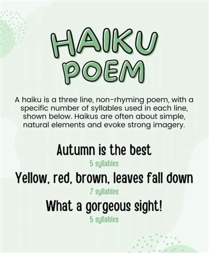 Haiku is a style of poem that originated in Japan. It is a short, three-line poem that follows the pattern of five syllables in the first line, seven in the second line and five in the third line. Haikus are generally written to evoke images of nature.