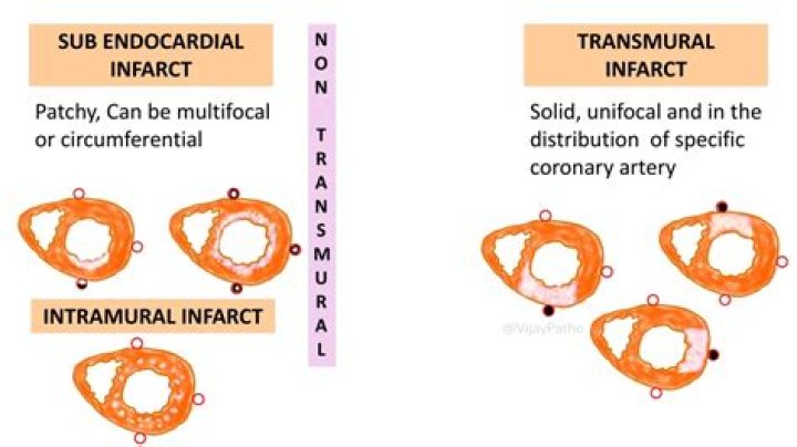 Transmural infarcts involve the whole thickness of myocardium from epicardium to endocardium and are usually characterized by abnormal Q waves on ECG. Nontransmural (including subendocardial) infarcts do not extend through the ventricular wall and cause only ST-segment and T-wave (ST-T) abnormalities.
