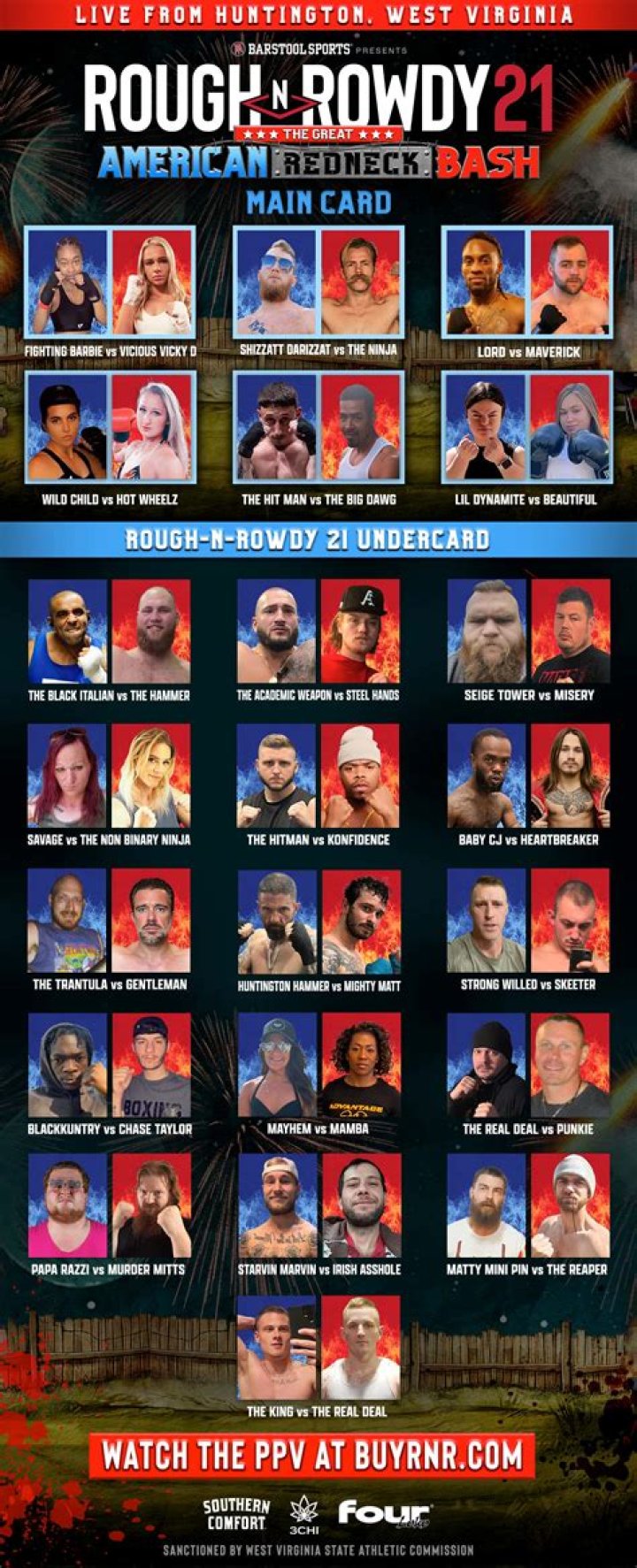 About. Rough N Rowdy Brawl is a local amateur boxing competition in West Virginia. Acquired by. Barstool Sports.
