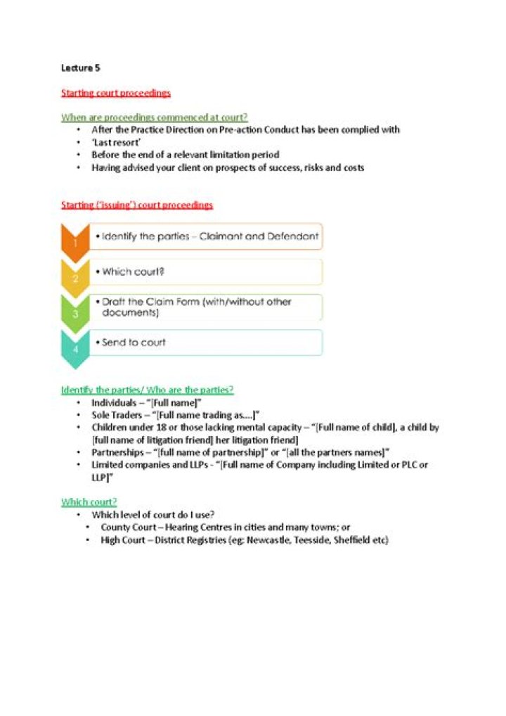 Civil Claims: Commencement of proceedings. Formal civil proceedings are generally started by the claimant completing a Claim form and sending it to the Court. ... the time period within which court proceedings must be served). The clock then starts ticking for service of proceedings on the defendant.