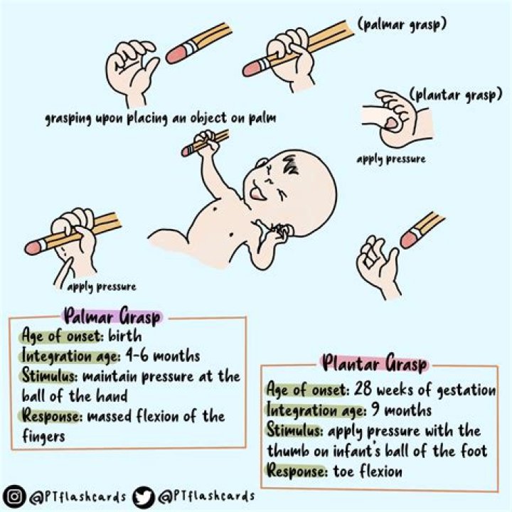 The palmar grasp reflex is present at birth and persists until 4 to 6 months of age. When an object is placed in the infant's hand, the fingers close and tightly grasp the object. The grip is strong but unpredictable.