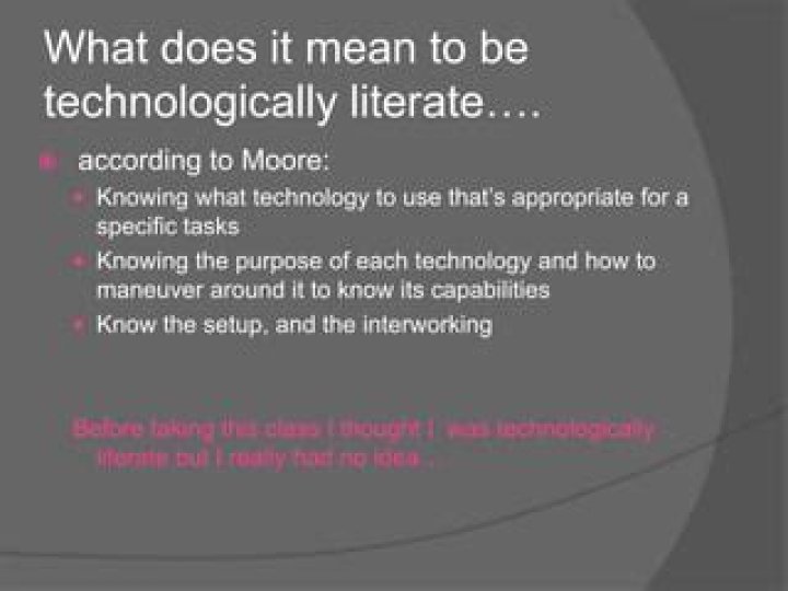 the 21st century. ( Ba, Ta l l y, & Ts i k a l a s , 2002, p. 4) Technology literacy can be defined as “know l- edge about what technology is, how it works, what purposes it can serve, and how it can be used effi- ciently and effectively to achieve specific goals” ( Bu rk h a rdt et al., 2003, p.