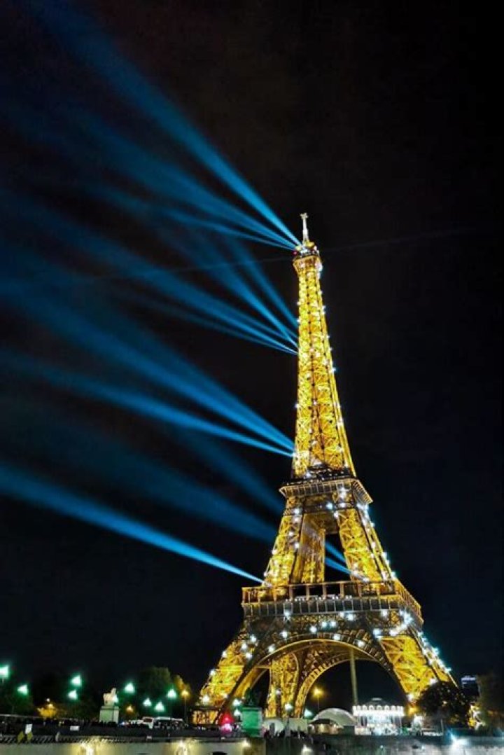 Each night, instead of the normal orangish-yellow lighting, the Eiffel Tower will be colored blue with yellow stars to resemble the European Union flag. ... The Eiffel Tower also was lit blue (see photo above) on May 9, 2006, in honor of the 20th celebration of Europe Day.
