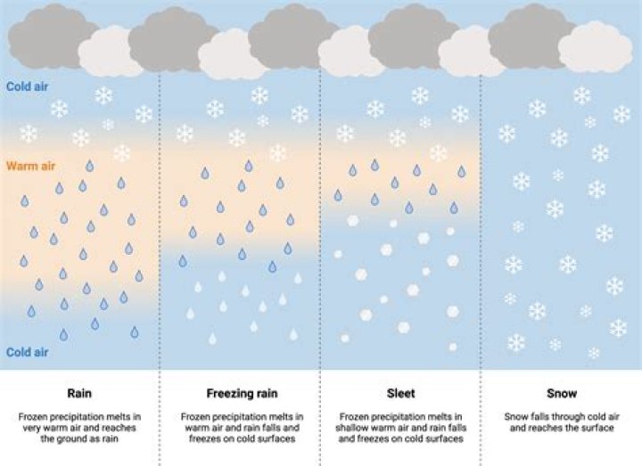 If the air is above freezing, the precipitation will most likely be rain. If the air is below freezing, the precipitation will most likely be snow. When air temperature is only a few degrees above freezing, precipitation may fall as sleet.