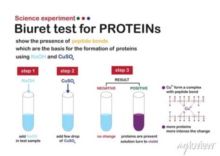 The biuret test is a chemical assay that detects the presence of proteins in a sample. The test relies on a color change to confirm the presence of proteins. If proteins are found, the sample will turn violet.