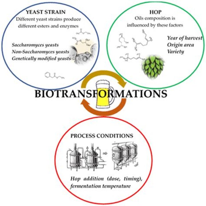 Generally defined as the process by which a substance changes from one compound into another by way of chemical reactions, biotransformation purportedly occurs in beer when certain terpenoids in hops are in the presence of specific yeast strains during active fermentation, which transforms them into other terpenoids.
